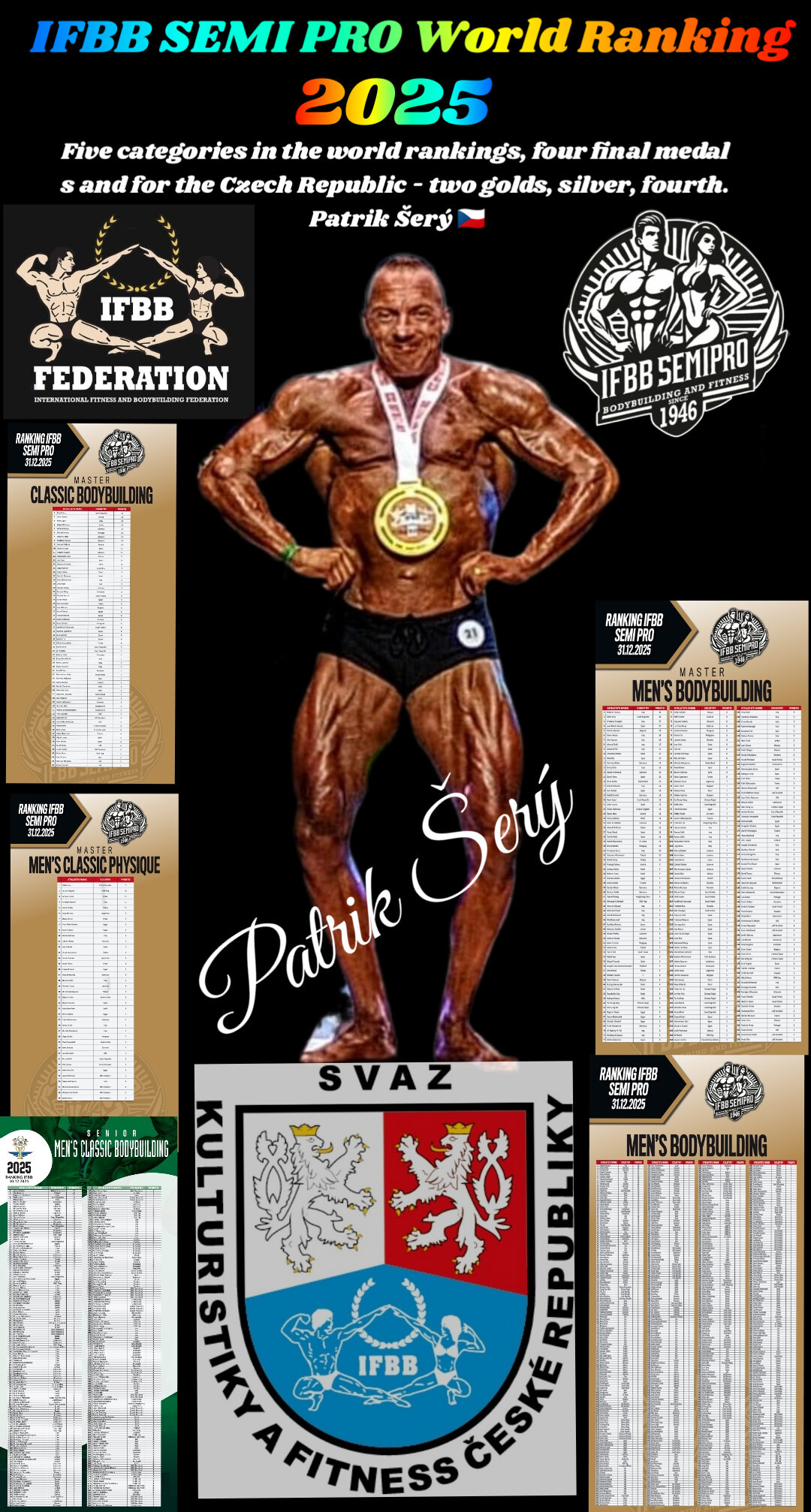 Český kulturista Patrik Šerý z Olomouce znovu potvrdil výjimečné postavení na světové scéně. V celosvětovém žebříčku IFBB Semi Pro se stal nejúspěšnějším závodníkem mezi medailisty za roky 2024 a 2025 a obhájil tak loňské prvenství.