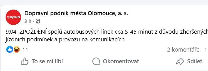 Dopravní podnik města Olomouce informuje o zpoždění autobusových linek, některé z nich dokonce nevyjely vůbec. „Zpoždění spojů autobusových linek cca 10 až 50 minut z důvodu zhoršených jízdních podmínek a provozu na komunikacích,“ uváděl Dopravní podnik města Olomouce na sociálních sítích dnes ráno. Postupně se čas zpoždění zkrátil na nynějších 5 až 25 minut. Některé linky ovšem ráno nevyjely vůbec. Podobné problémy s MHD se odehrávají od rána například i v Přerově.