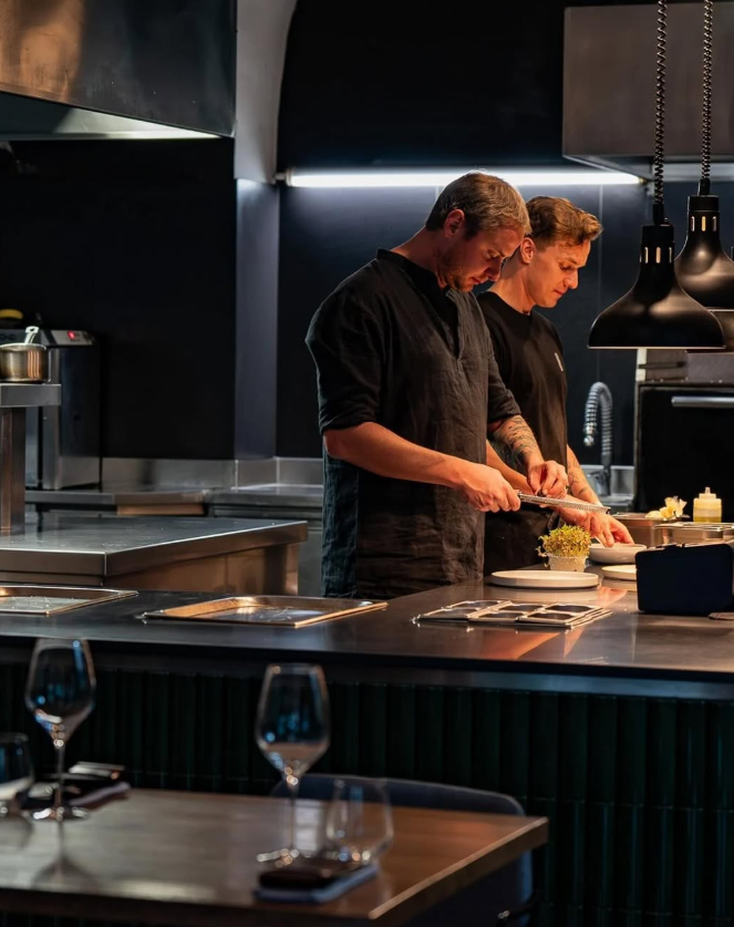 „V otevřené kuchyni, která je vidět z celého podniku, tým připravuje moderní jídla s jemnými mezinárodními akcenty.“